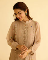 A fine chanderi kurta styled with colourful thread flowers styled with embroidered laces to complete the look.