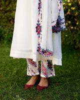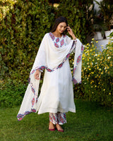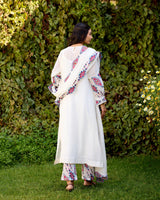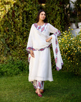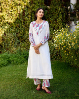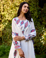 A fine chanderi kurta in white with a colourful thread embroidered pattern inserted in the neck and sleeves to complete the look.