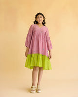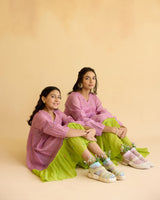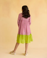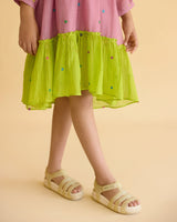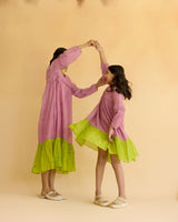 A lilac dress in fine chanderi with colourful tiny flowers all over, accented with pleats on the bodice and sleeves, styled with a pop of lime at the hem.