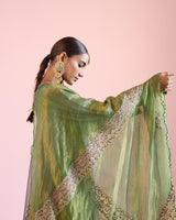 A kurta in tissue organza with a heavy gold embroidered neck detail highlighted with hand embroidered coloured zero size moti in green accented with embroidered cuff at the sleeves.