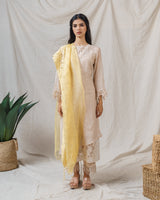 Ecru beige kurta in fine chanderi with thread embroidered organza insert in the center, accented with hanging fringes and thread details on the sleeve and hem.