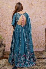 Bluesteel zari embroidered anarkali, embellished with florals and paired with churidar and dupatta