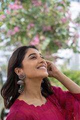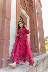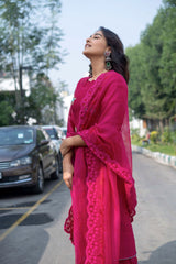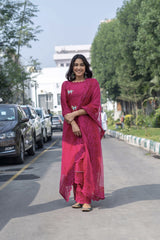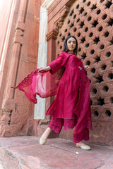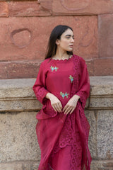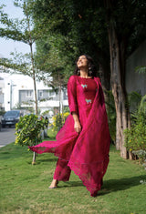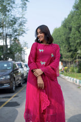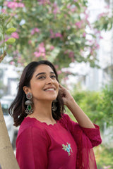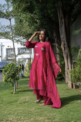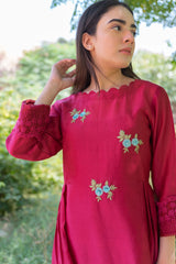 Classic magenta kurta in chanderi with delicate scallop on the neckline with pleats on both side, thread embroidered organza details, highlighted with intricate hand crafted flowers in blue thread.