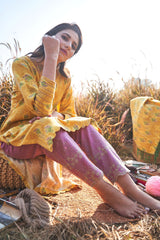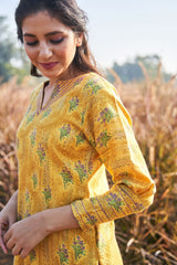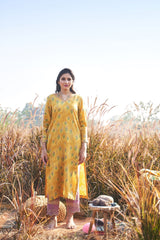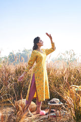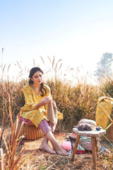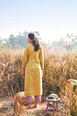 A printed woolen kurta in yellow accented with lilac colour thread on neckline and cuff sleeves.