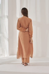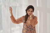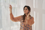 A fully multi colour thread embroidered kurta highlighted with an organza insert at the neck, accented with zari and pleating on the sleeves.