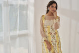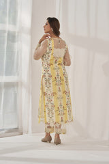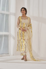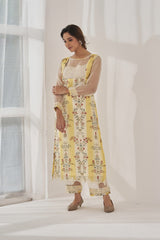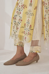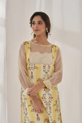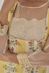 A printed kurta in yellow and white accented with an organza insert at the neck and sleeves with a laced cuff , enhanced with cutout lace at the hem.