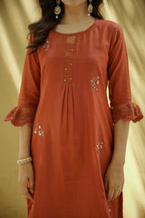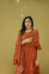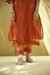 A chanderi kurta in rust highlighted with thread embroidery details at the hem and sleeves, accented with hand embroidered gold booties.