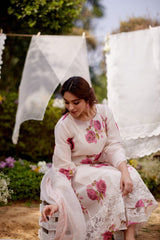 A rose printed kurta with thread embroidered lace accented with a hand embroidered rose printed insert.