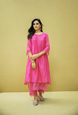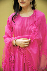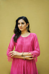 Hot pink Kurta with delicate pleats on the neckline, thread embroidered organza details, accented with hanging embroidery threads on the sleeves.