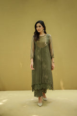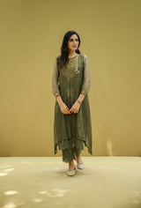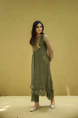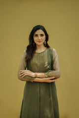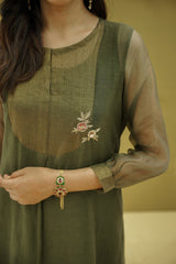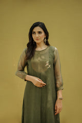 Moss green kurta with tissue insert in the center, accented with a hand crafted flower in gold on the side.