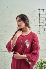A fine chanderi kurta in cherry red accented with a hand crafted floral motif on one side, highlighted with printed loops and floral thread work at the bottom.