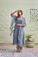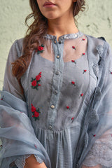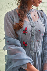A fine chanderi kurta in english grey accented with an organza insert with hand crafted flowers , finished with heavy thread embroidery at the bottom.