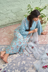 A powder blue dupatta in organza with delicate thread lace put diagonally, highlighted with beautiful big flowers in pink.