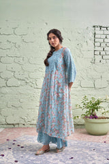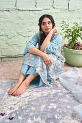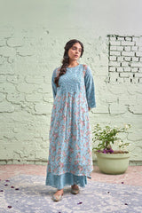 A fine chanderi printed kurta in powder blue, accented with a thread detailed insert in front, sleeves highlighted with floral motifs in thread