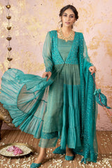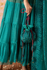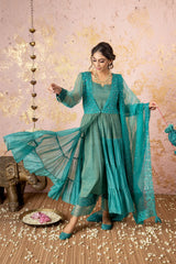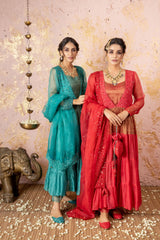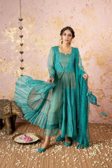 Deep green tunic with thread embroidered layered overlay and embroidered pant with four side embroidered organza  dupatta