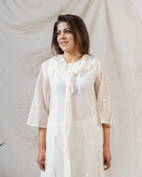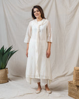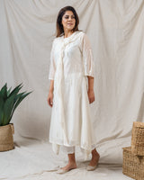 Cosmos white ensemble with delicate hanging fringes allover, accented with dropping coul neck line.