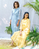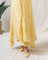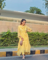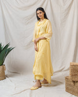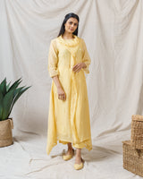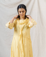 Pale yellow iris ensemble with delicate hanging fringes allover, accented with dropping coul neck line.