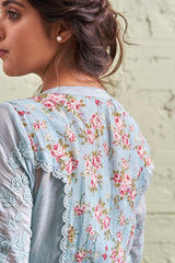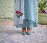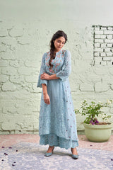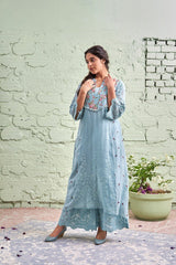 A fine chanderi kurta in powder blue, accented with printed insert in front & back, highlighted with embroidered buds.