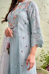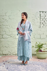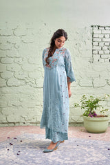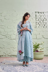 JAMUN ki tokri ( neeli)- set of 3- kurta with embroidered buds, pants & dupatta - Naaz By Noor
