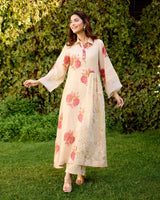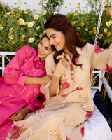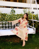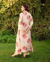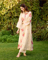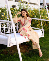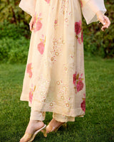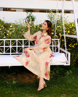 A floral tissue chanderi kurta with a hand embroidered sequin insert on the waist with multi-coloured sequin styled with a collar and organza details on the sleeves.