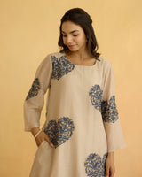 A fine chanderi kurta in grey with thread embroidered hearts in blue all over accented with linen at the hem to complete the look.