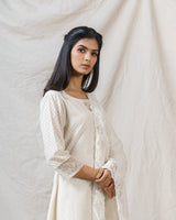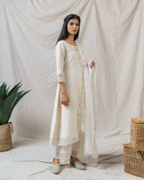 Pearl White Kurta with delicate organza insert on the neckline, thread embroidered organza details, accented with thread embroidered organza at the hem and sleeves.