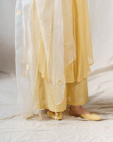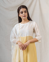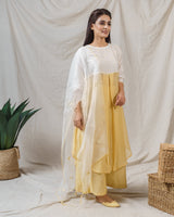 Dual color kurta with yellow hand crafted delicate motif on pearl white chanderi upper, accented with a center pleat and rounded edges at the hem.