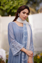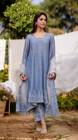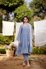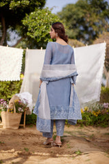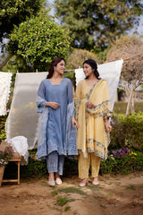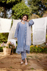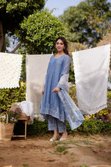 BLUE AFRICAN LILY fields- set of 3( A-line kurta, pants & dupatta) - Naaz By Noor