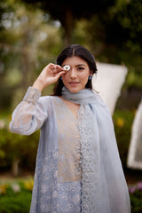 A dupatta in organza with delicate thread embroidered rose cut lace to complete the look.