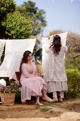 An all over thread embroidered kurta accented with A-line sleeves, comes with a slip with a enhanced ghera.