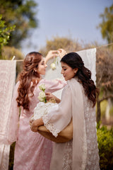 A dupatta in organza with delicate thread embroidered rose cut lace to complete the look.
