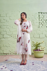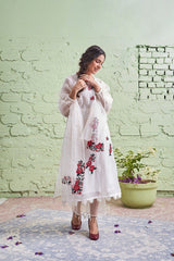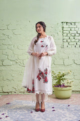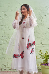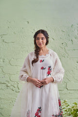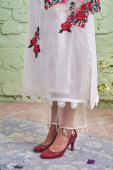 A fine chanderi kurta with hand crafted cherry red flowers all over, highlighted with delicate thread details.