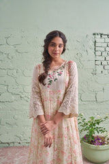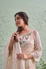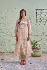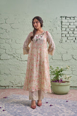 A fine chanderi kurta in print, accented with a hand embroidered organza insert, highlighted with thread embroidered sleeves.