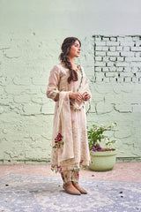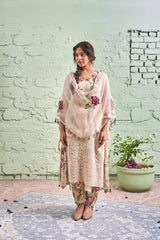 A beige colour kurta in fine chanderi with heavy thread embroidered details at the bottom, accented with a printed neck with scalloped thread lace in green lined with printed fabric..