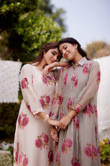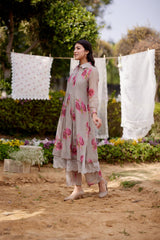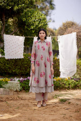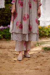 A rose printed kurta in grey accented with a collar and lace details at the hem.