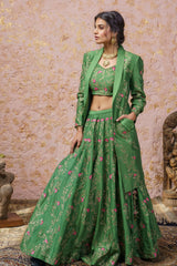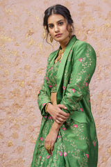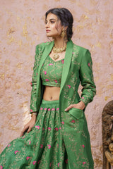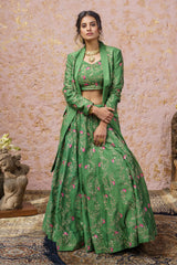 Vintage green lehenga, embellished with fuchsia florals and paired with dupatta