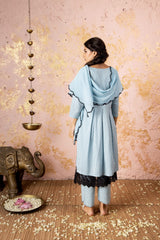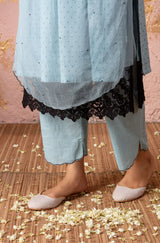 Blue kurta with front organza panel with schiffli laced slip along with straight pants with curved hem and scalloped embroidered stole with eyelets