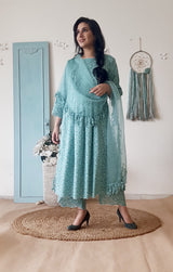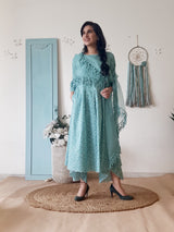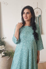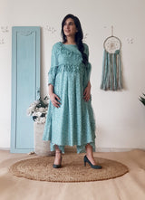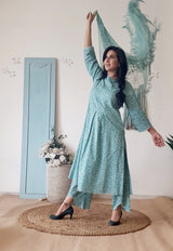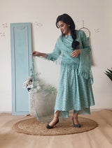 A printed teal floral kurta highlighted delicate details at the hem and sleevesÂ