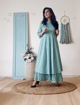 A printed teal floral kurta highlighted delicate details at the hem and sleevesÂ