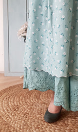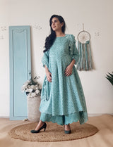 A printed teal floral kurta highlighted with details at the hem and sleeves