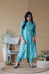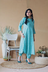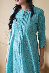 A printed teal floral kurta rounded at the hem highlighted with thread flowers, accented with pleats at the neckline