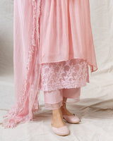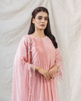 Blush Pink Kurta with delicate pleats on the neckline, thread embroidered organza details, accented with hanging embroidery threads on the sleeves.