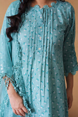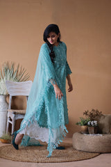 BLUE POPPY ROUNDED KURTA WITH IVORY SCHIFFLI PLAZZO AND DUPATTA