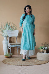 A printed teal floral kurta rounded at the hem highlighted with thread flowers, accented with pleats at the neckline
