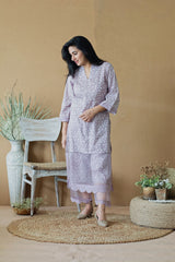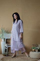 A printed lilac musk kurta in cotton accented with organza and thread lace at the hem