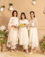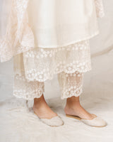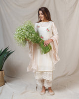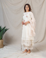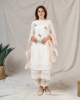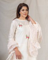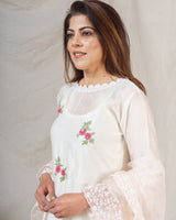 Magnolia white kurta in chanderi with delicate scallop on the neckline with pleats on both side, thread embroidered organza details, highlighted with intricate hand crafted flowers in hot pink thread.