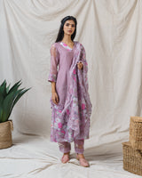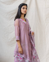 Opera Mauve Kurta in chanderi with printed half collar, accented with diagonal cut thread details at the hem.