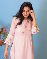lilac kurta with delicate zari insert with contrasting floral hand work on the neckline, thread embroidered organza details, accented with thread embroidered organza at the hem and sleeves.