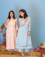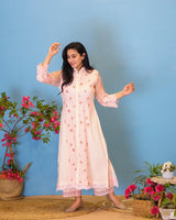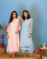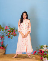 Powder pink straight kurta in printed cotton , accented with thread embroidery at the hem and sleeves.