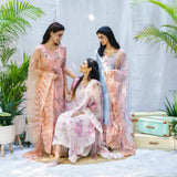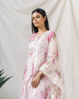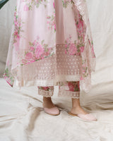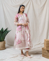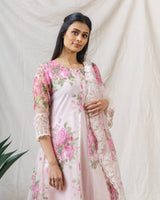 Salted Pink Kurta with attached floral sheer organza overlay, accented with delicate thread work on the hem.